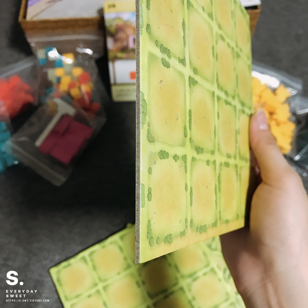 개인판 6개, 그리고 건물과 재료 컴포들, 점수용지가 들어있어요
