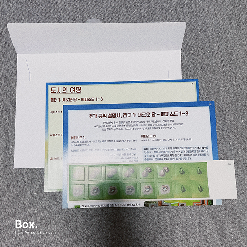 개인판, 규칙서, 타일펀칭보드,미션봉투등등이 들어있어요