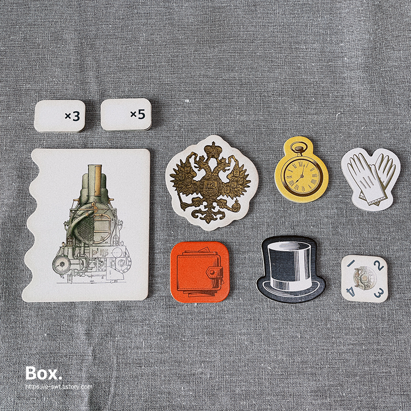 구성물은 규칙서, 펀칭보드, 각종컴포와 카드들입니다.